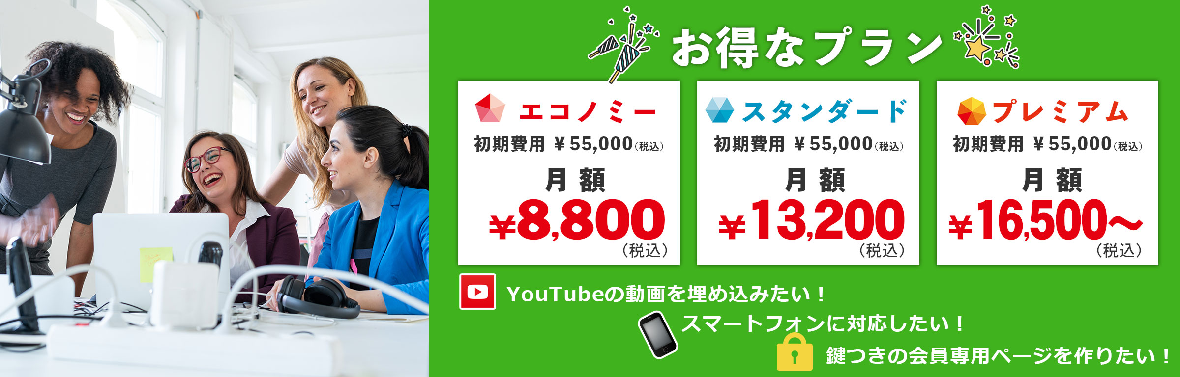基本ページ作成(トップページ、会社概要、商材紹介、お問合せ)、ブログ設置、検索エンジン対策、ドメイン・サーバ取得、タブレット・スマートフォンの対応まで含め、月額13,200からホームページが作成できます。